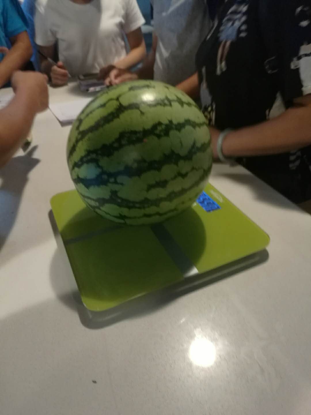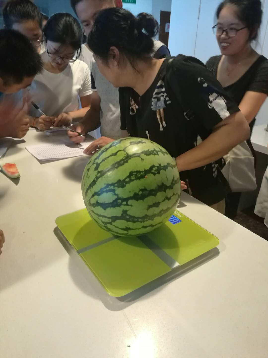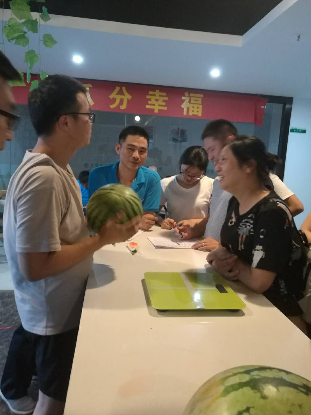 游戏规则:挑选一个西瓜,参赛人员分别说出预估的西瓜重量,估重与实际称重相差最小的人员,判定为胜出。